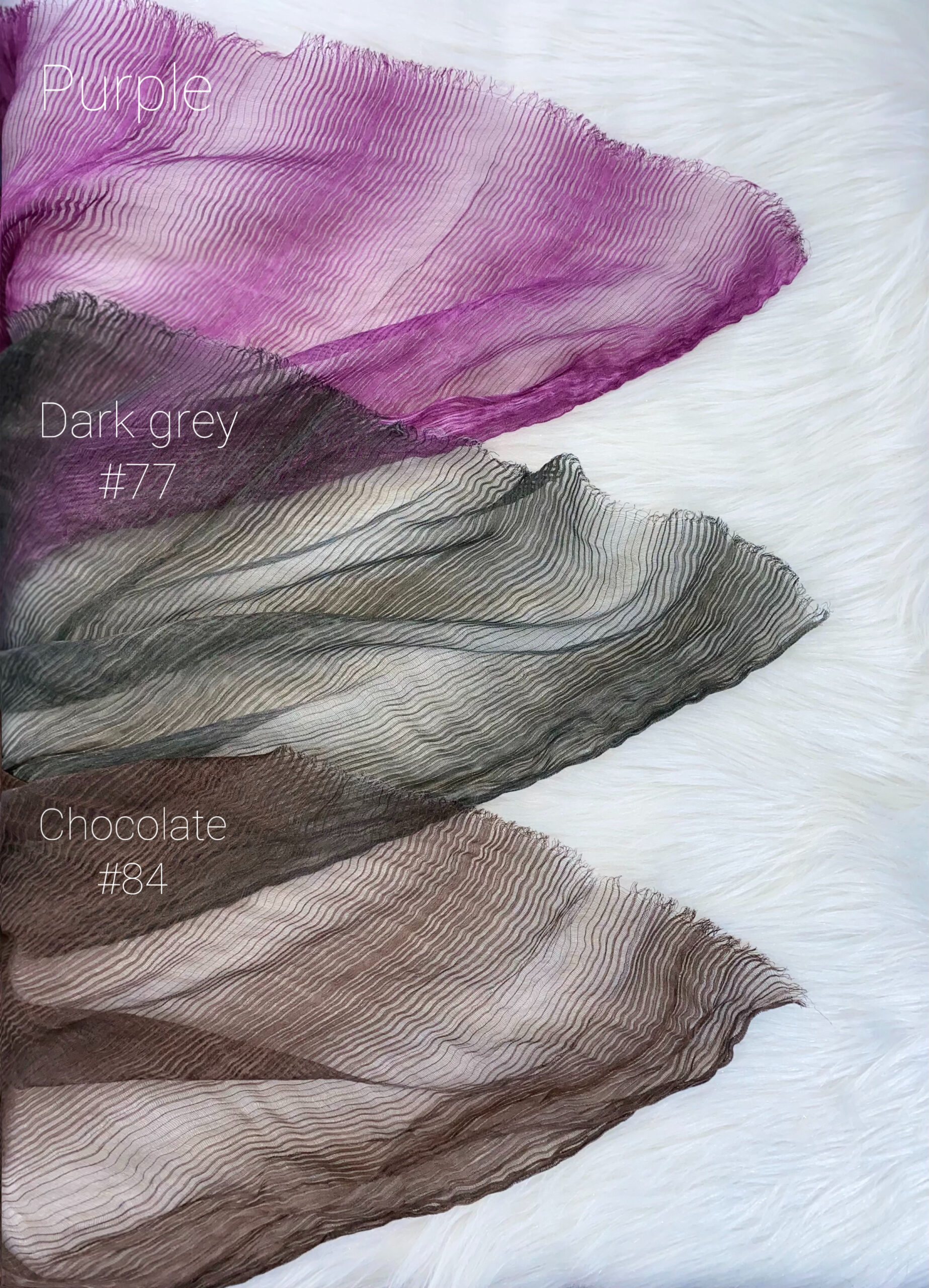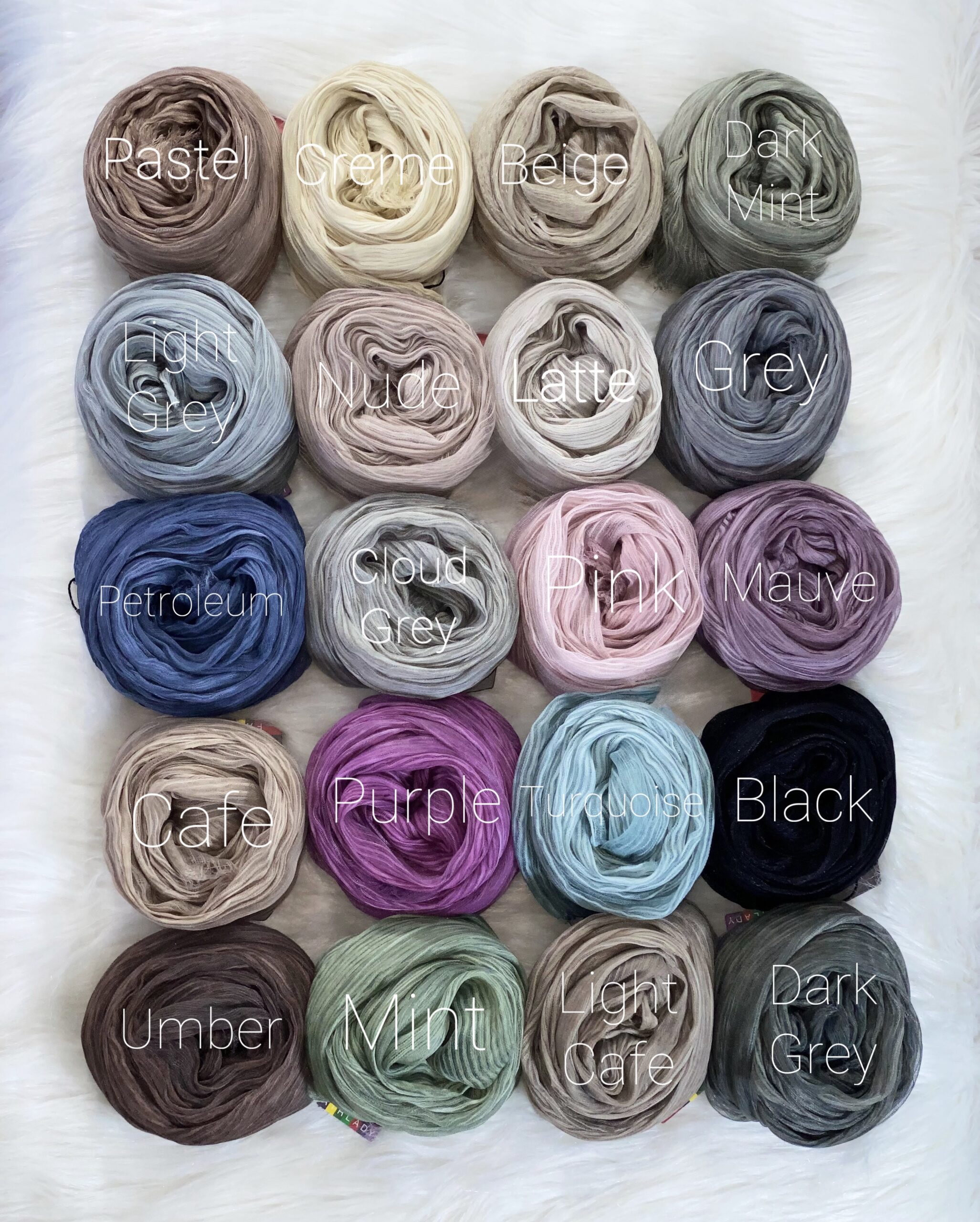 | اللون | Beige, Black, Cafe, chocalate, cloud grey, creme, dark grey, Dark mint, Grey, Latte, Light Cafe, Light Grey, mauve, Mint, Nude, Pastel, petroleum, Pink, purple, turquoise, umber |